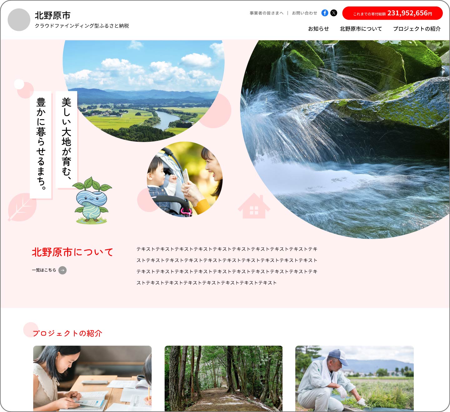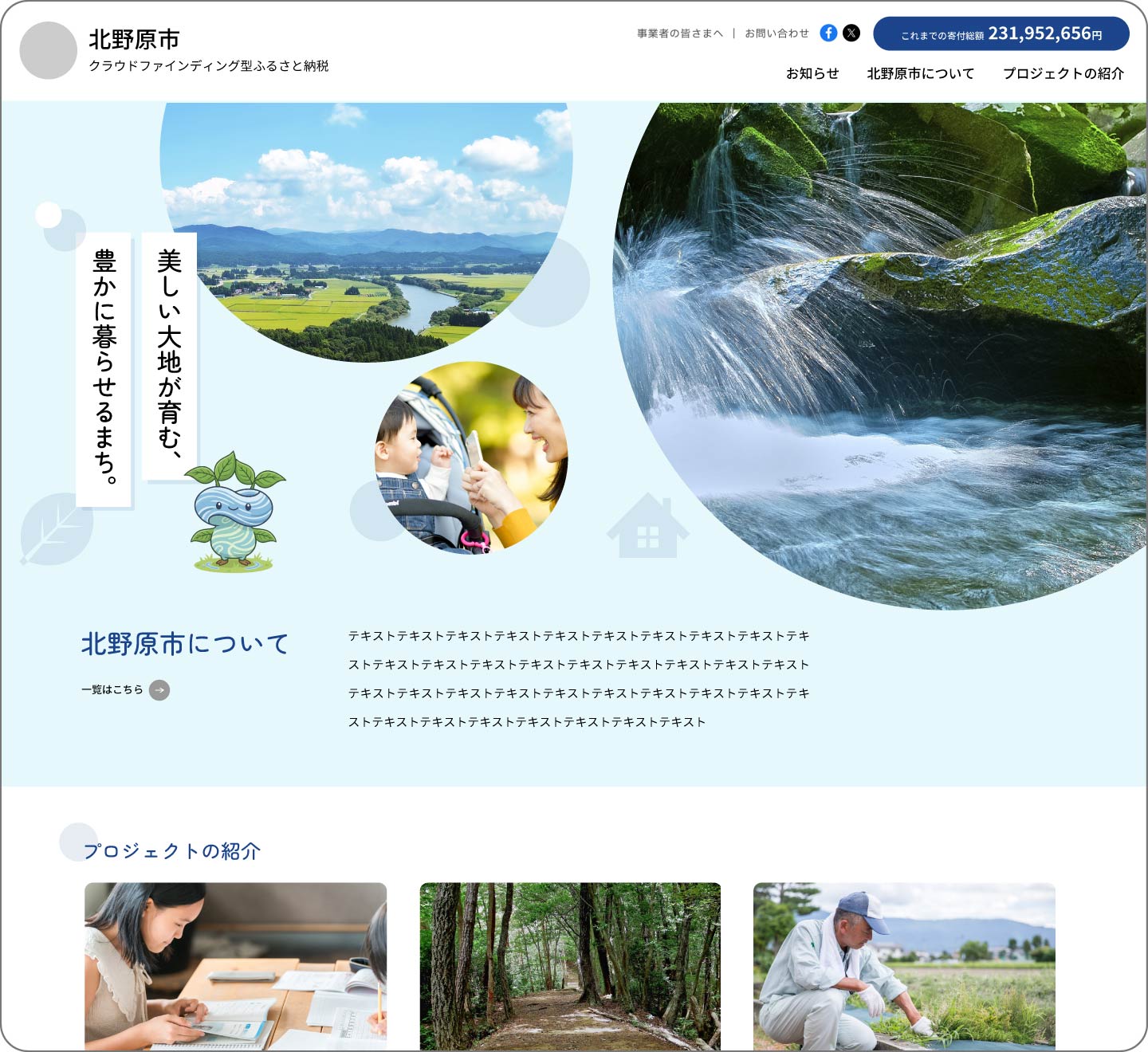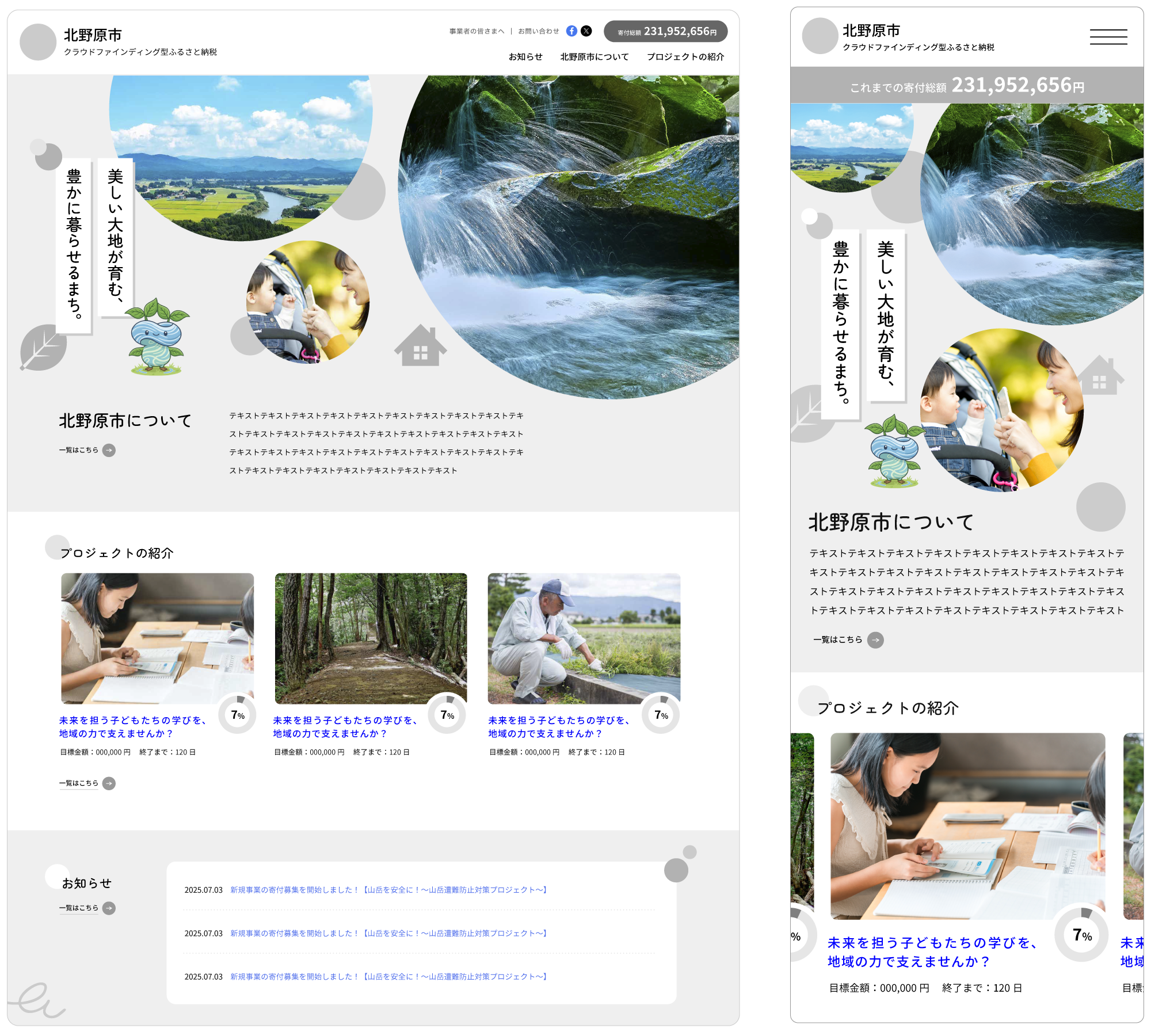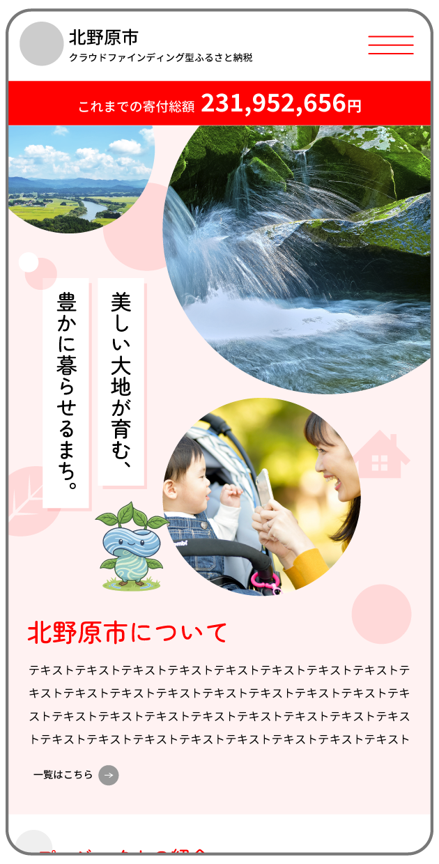 丸型の写真を使った、楽しい雰囲気のデザイン。自治体のキャラクターを活用しながら、親しみやすさを自然に演出できます。